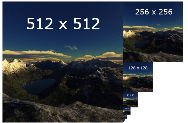 Mipmap 이라는건 Main Texture Image 를 downsized 를 시킨 여러개의 사진이라고 생각하면 된다. 즉 여러개의 해상도를 조정하며 만든 여러개의 Image 라고 생각 하면 된다. Computer Vision 에서는 Image Pyramid 라고도 하는데, 여러개의 서로 다른 Resolution 의 Image 를 올려 놓았다고 볼수 있다. 아래의 이미지를 봐보자. 아래의 Image 를 보면 512, 512/2, 256/2… 절반씩 Resolution 이 줄어들고 있다.
